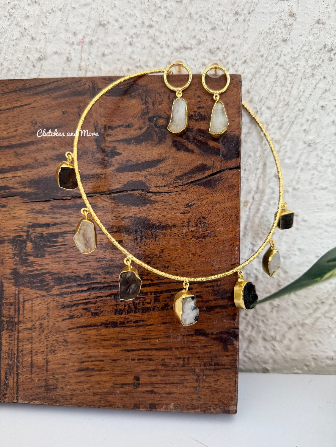 Elevate your everyday or festive look with the Ishana Choker Set — a minimal yet striking piece that blends earthy elegance with artisanal charm. This handcrafted brass choker features an eclectic mix of raw-cut semi-precious stones in organic shapes, each uniquely framed in matte gold. Paired with elegant matching drop earrings, this set brings a boho-luxe statement to both Indian and Western outfits.