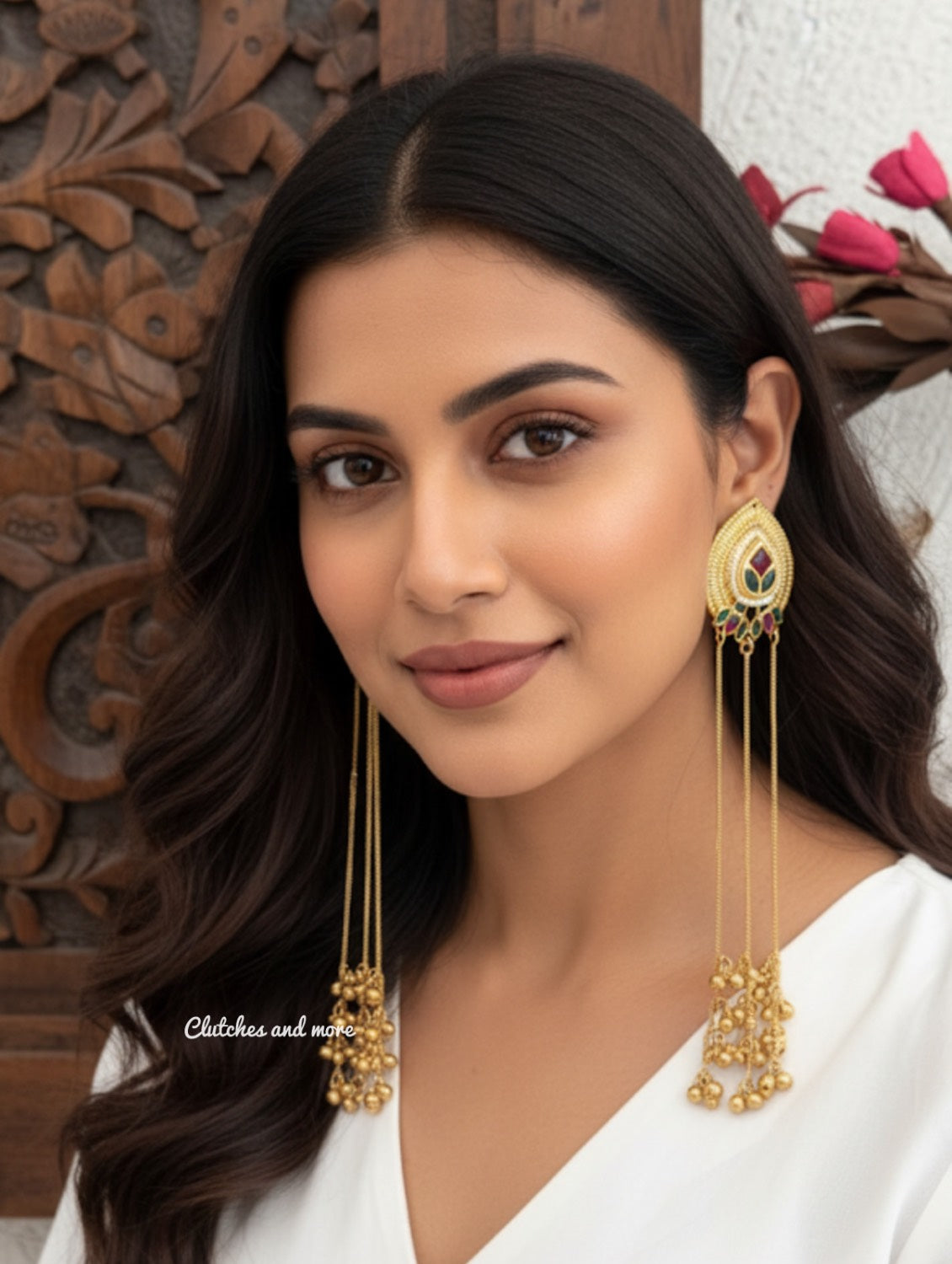 ✨ Danglers: Multiple long golden chains ending in tiny ghungroo-style beads that create a soft jingle