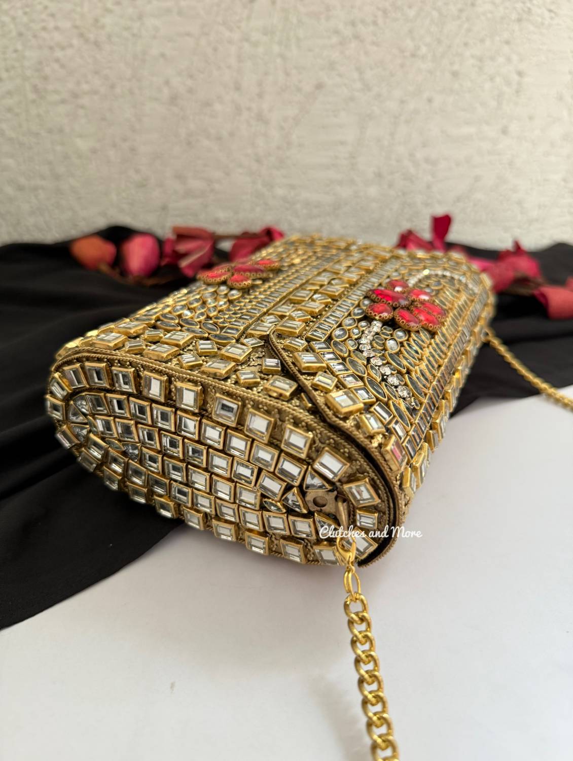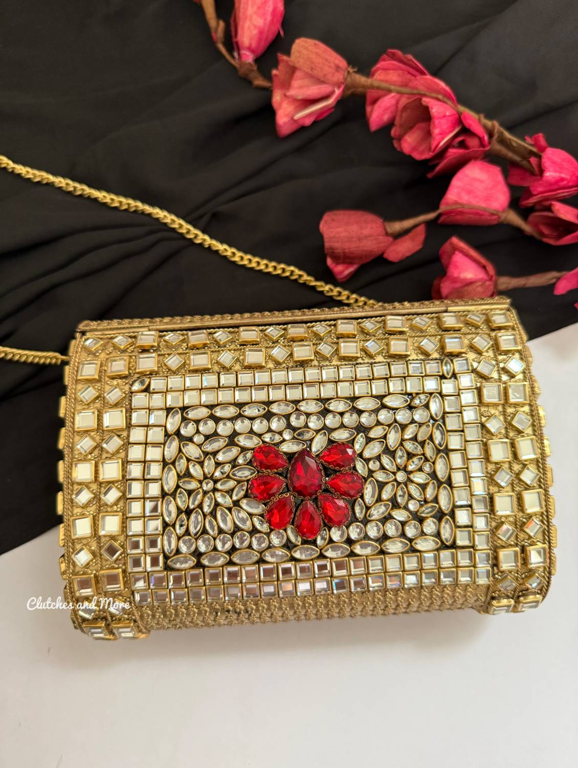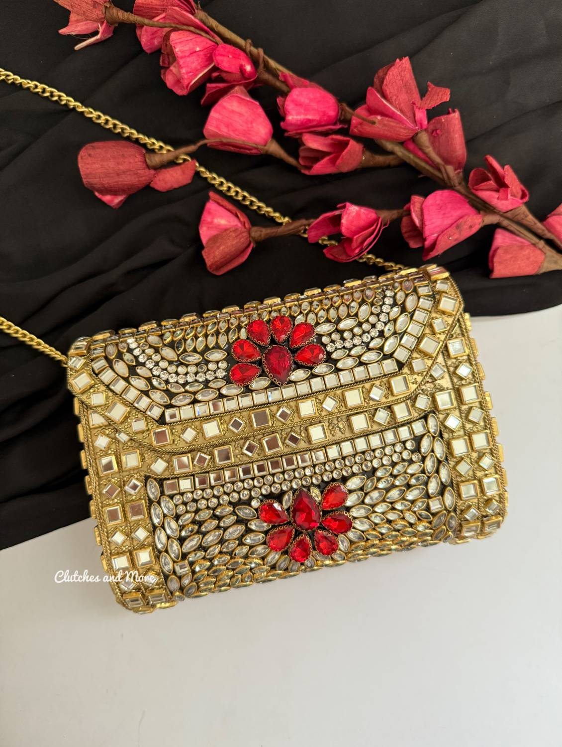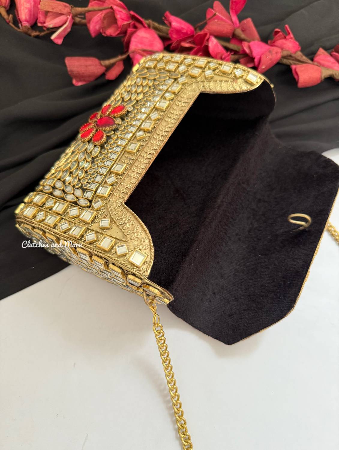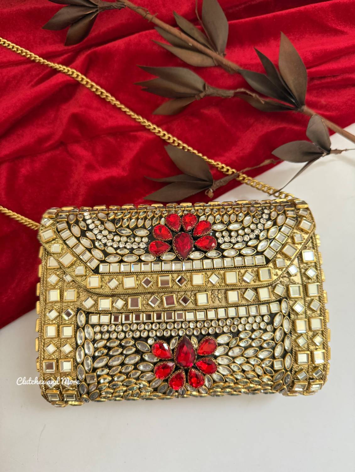 Kashish Kundan Brass Clutch Gold Red