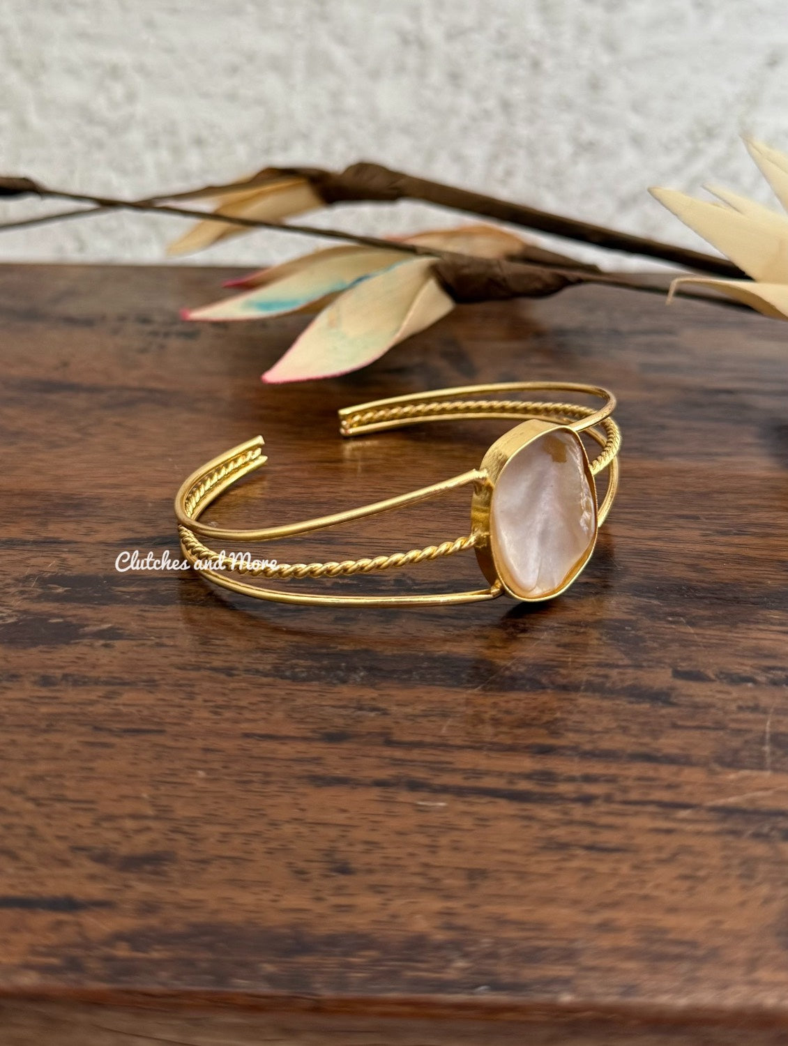 This beautiful bracelet is made of brass and features mother of pearl in the centre