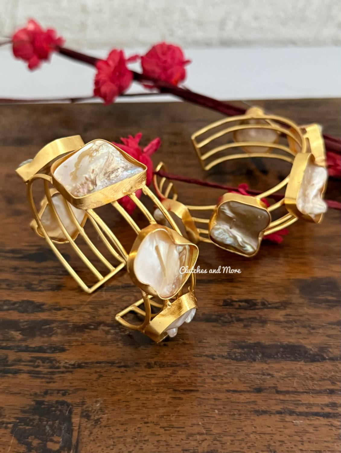 Make a bold statement with our handcrafted statement cuff, featuring raw-cut mother of pearl set in a luxe matte gold finish.