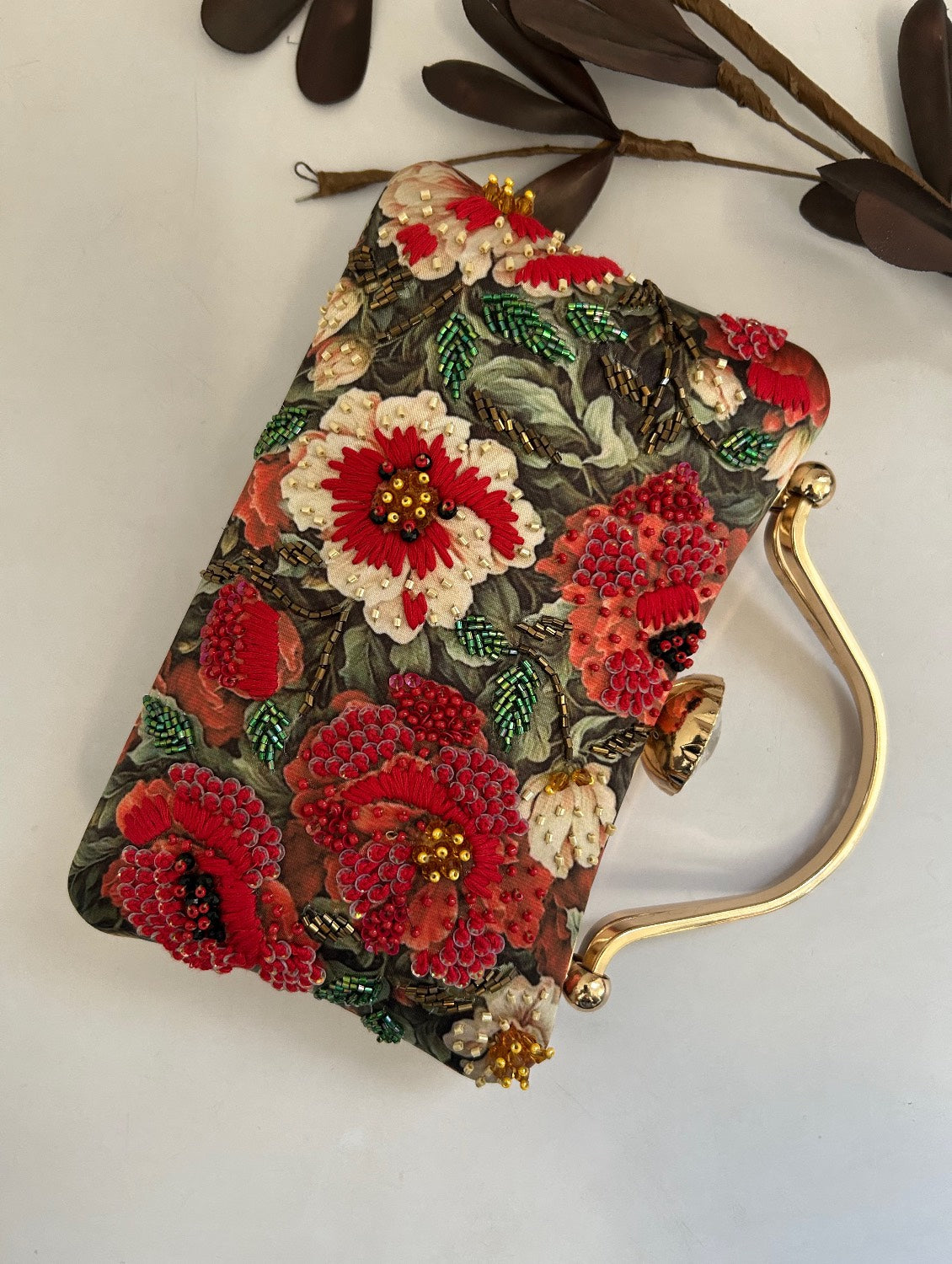 Poppy Green Red Floral Clutch with diamond handle