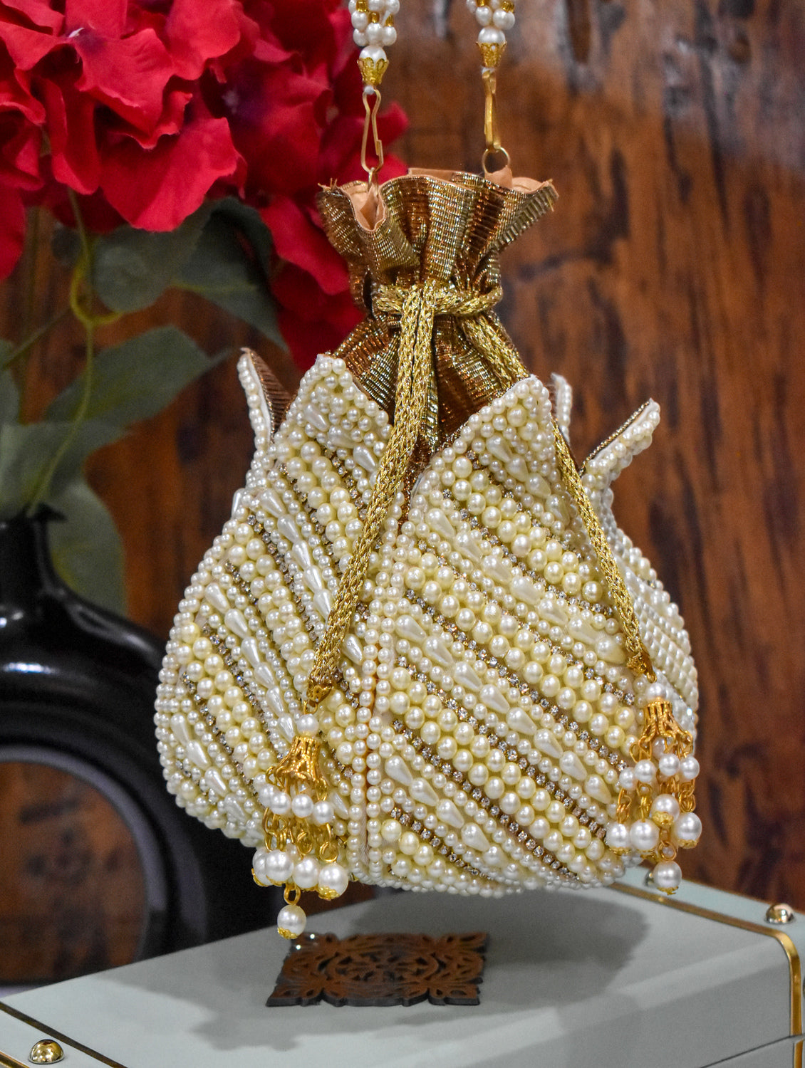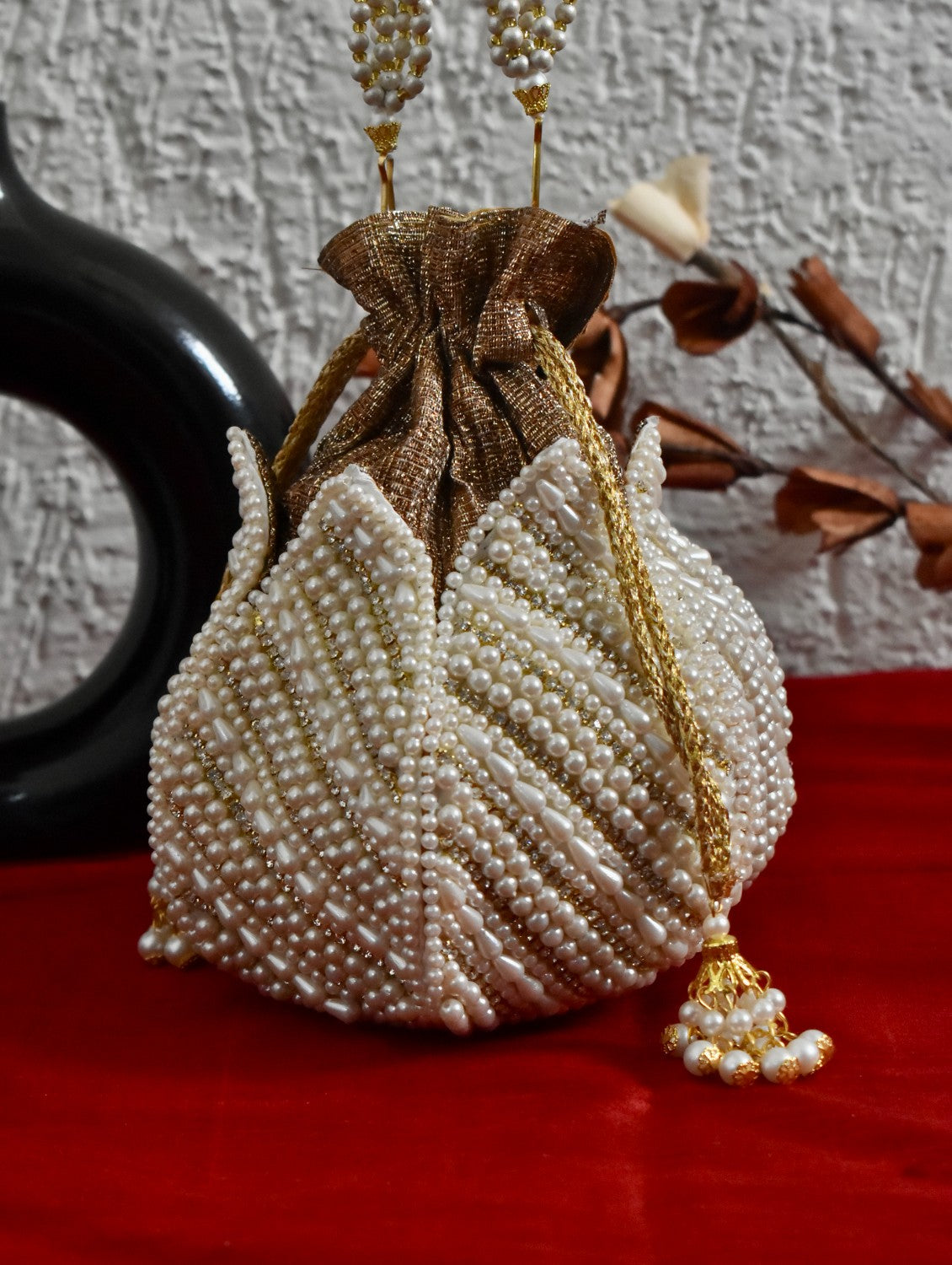 White pearl and stone potli in lotus style